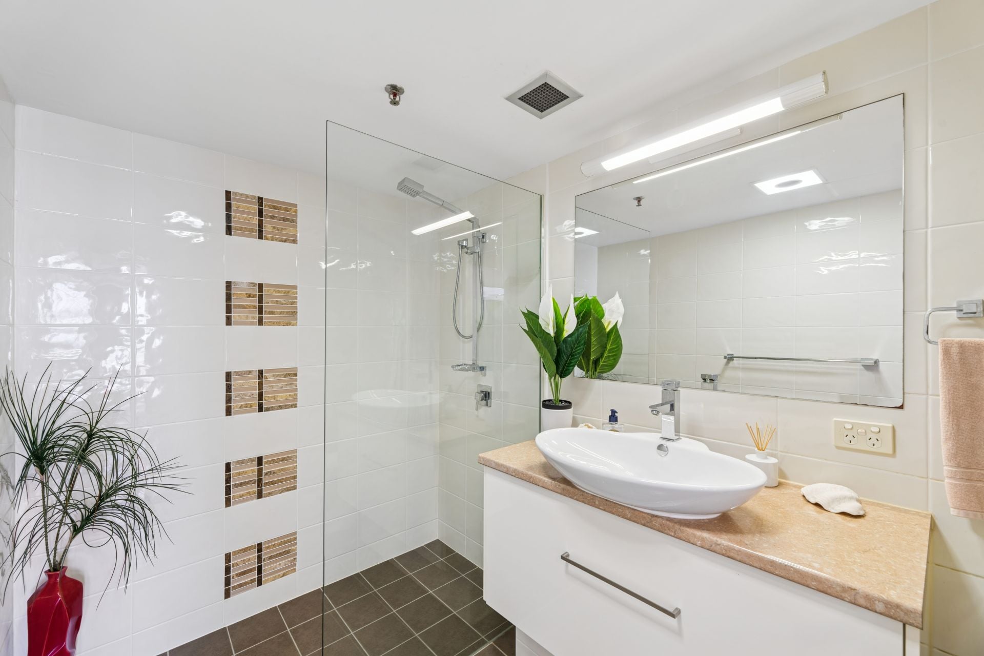 The modern kitchen features a generous breakfast bar and connects perfectly with the living and dining zones, while the master suite enjoys its own private ensuite. Foor-to-ceiling tiling in the bathrooms and step-free graded entries into the bathrooms provide for easy access. 3 new whisper-quiet air conditioners are fitted in the living area and both bedrooms.