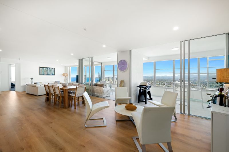 Designed for effortless living, the expansive open-plan layout creates an abundance of brightness and space flowing seamlessly to an oversized balcony capturing sweeping 270-degree views across the ocean, city skyline and mountain ranges beyond. Whether it's sunrise coffees or evening entertaining, this is a front-row seat to the best of the Gold Coast.
