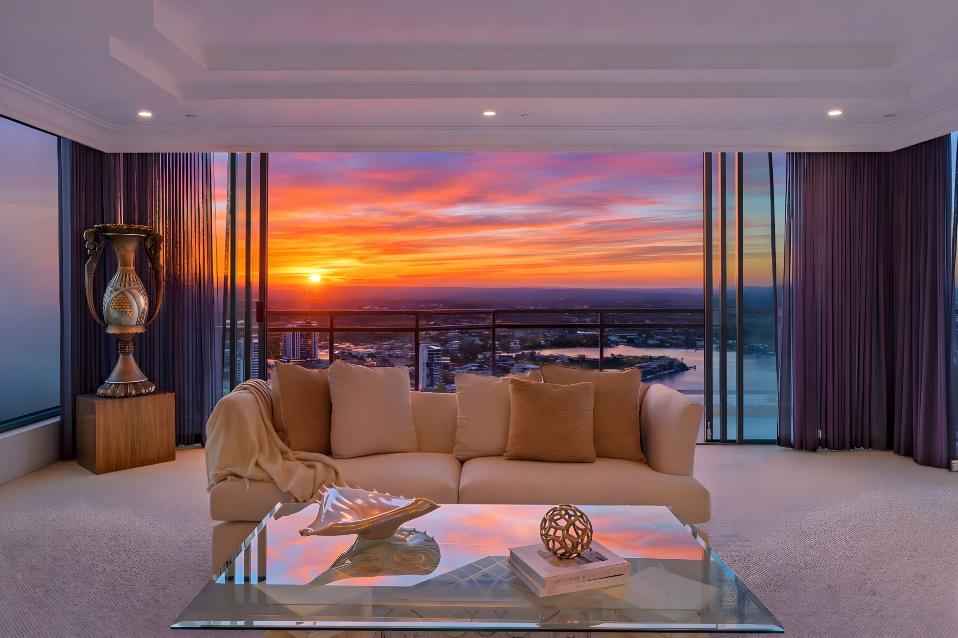 Wake to golden sunrises and unwind beneath vivid sunsets, all from the comfort of your own private sanctuary. Expansive floor-to-ceiling glass frames sweeping panoramic views of the river, the city skyline, and the lush hinterland beyond-creating a breathtaking backdrop by day and a dazzling, light-filled masterpiece by night.