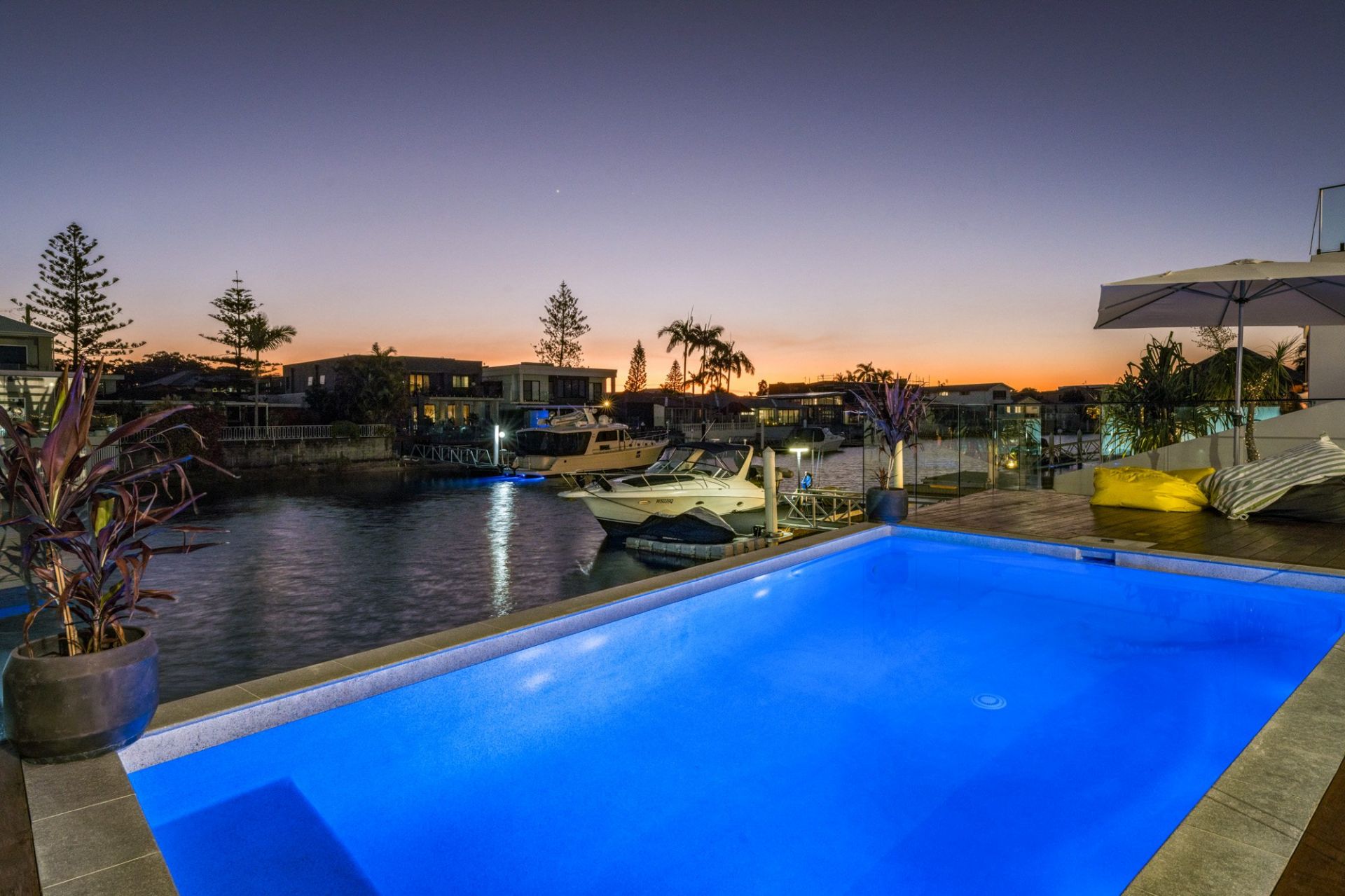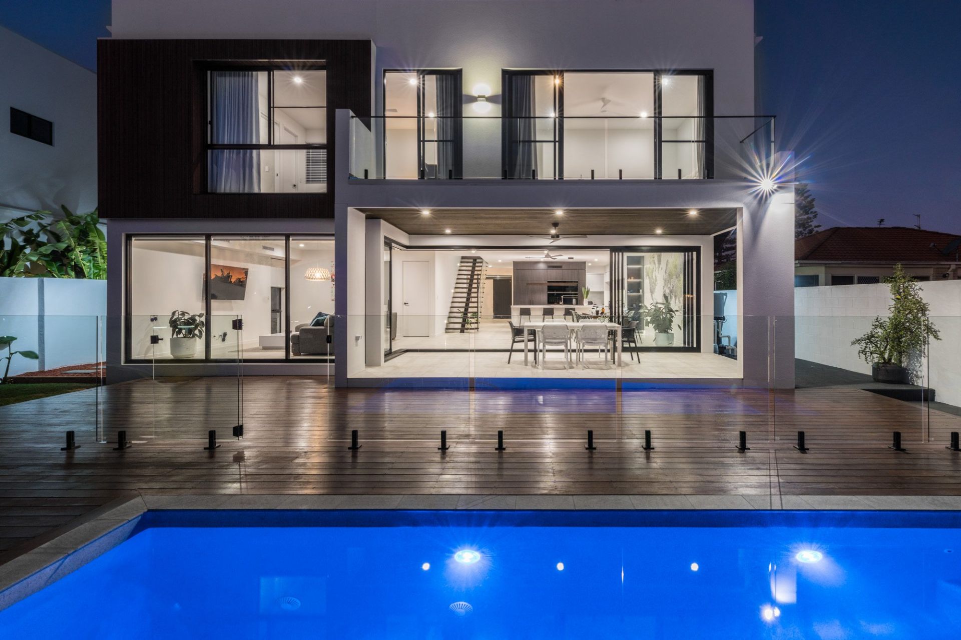 The artistry of stacking sliding doors unveils a captivating alfresco enclave, ensconced within premium timber decking, and commanding a view over the resplendent saltwater pool that merges gracefully with the expansive waterfront panorama.