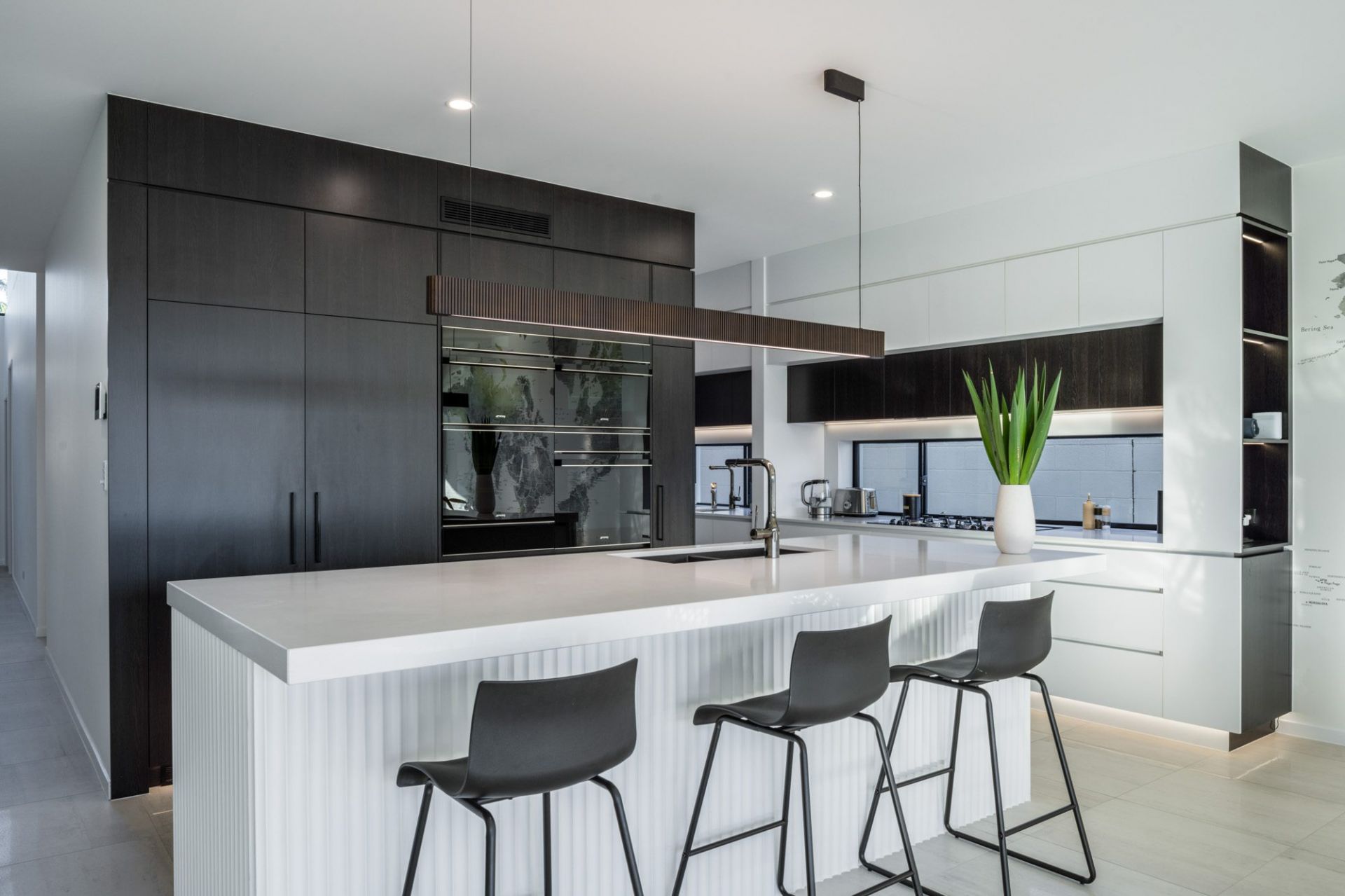 - Modern kitchen and butlers pantry comes with quality 60mm stone benches, Miele and Smeg oven, steamer, wine fridge, double Liebherr integrated fridge, electric cooktop and commercial-grade Zip Tap.