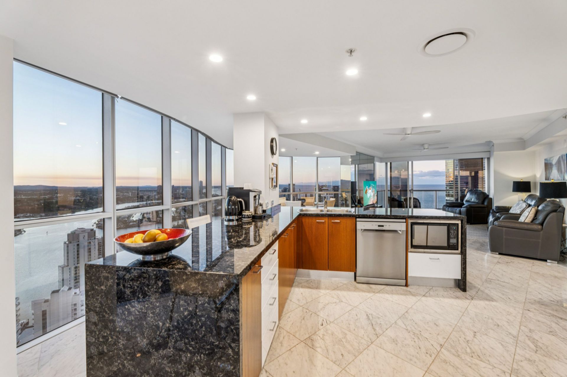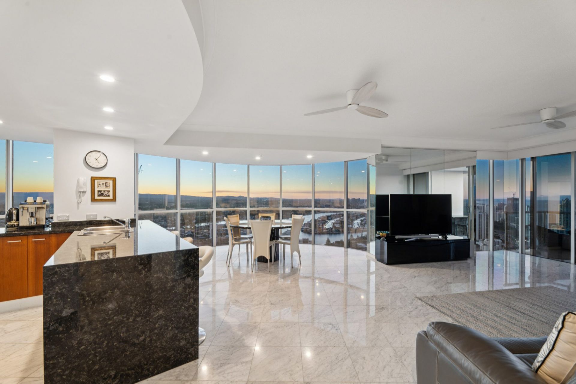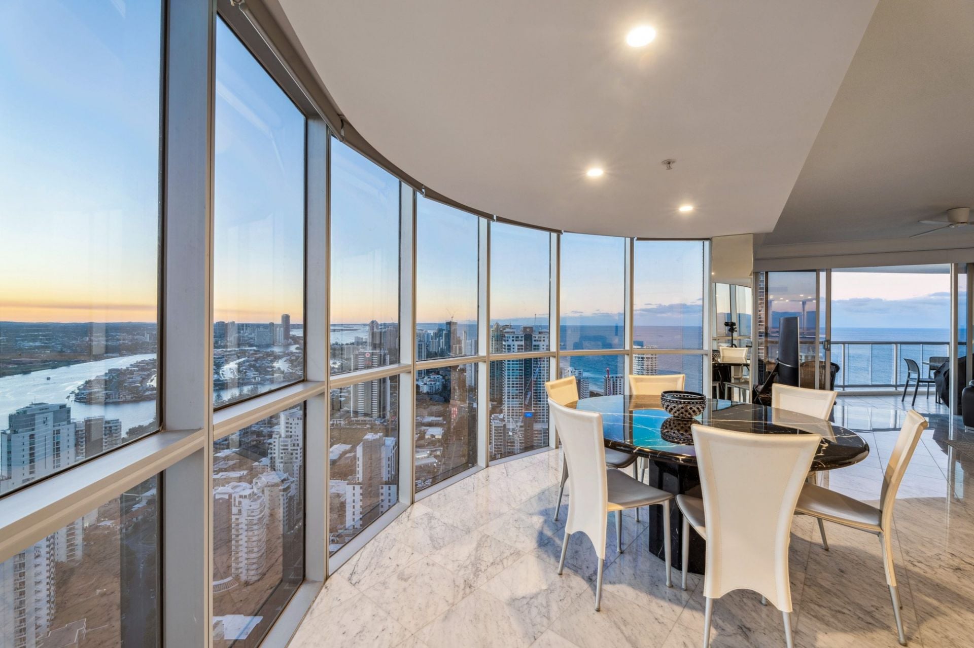 Step inside to discover open plan living and dining areas finished with elegant marble-tiled flooring and surrounded by floor-to-ceiling glass. The expansive layout is framed by panoramic outlooks stretching across the Pacific Ocean, Main River, Broadwater and hinterland - an ever-changing backdrop that defines coastal luxury.