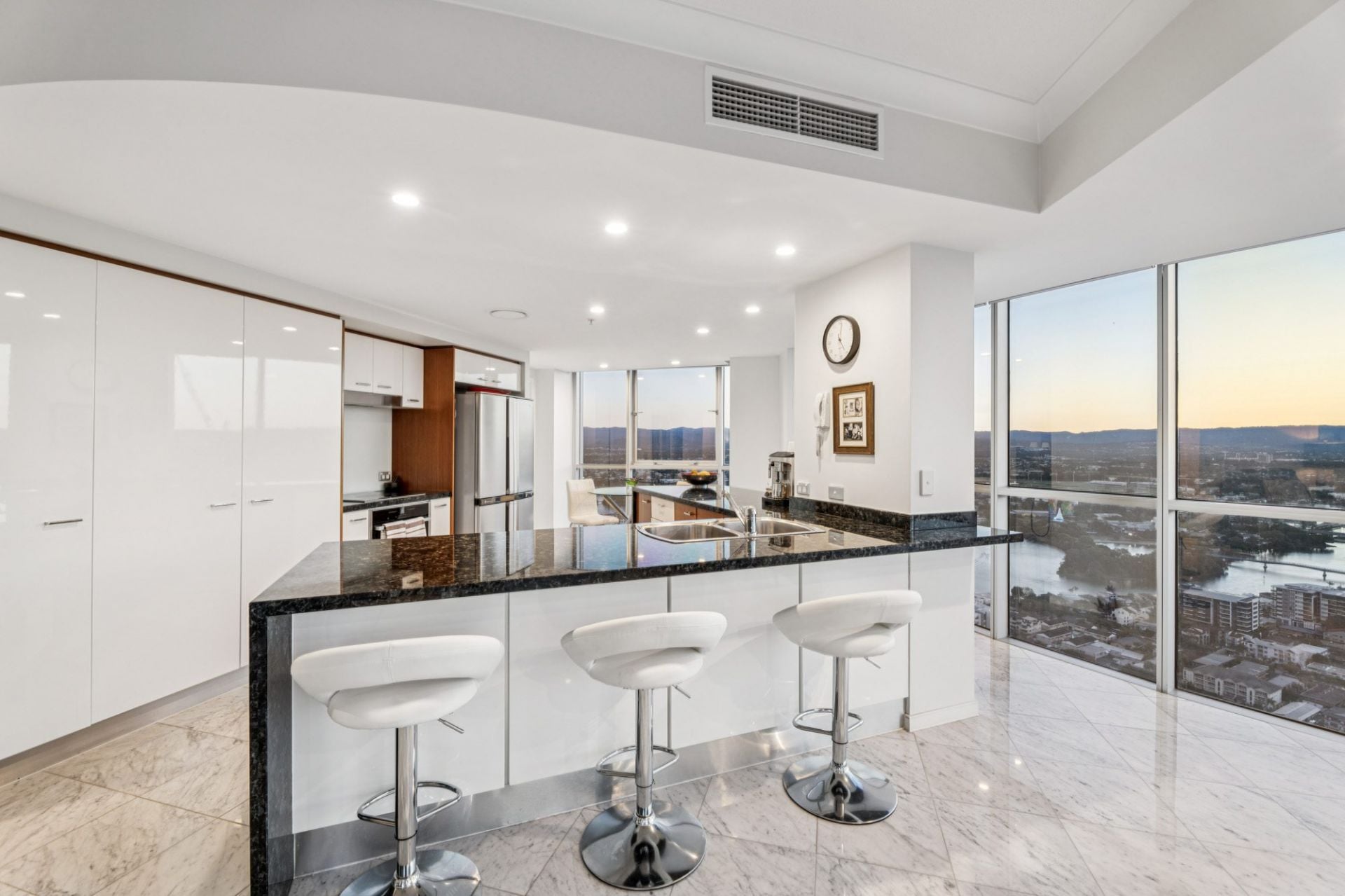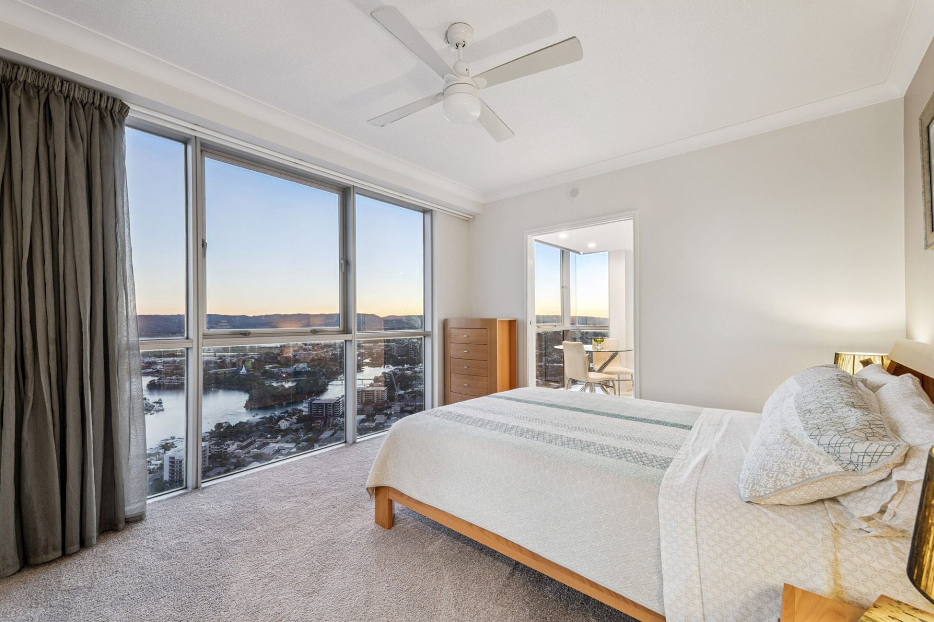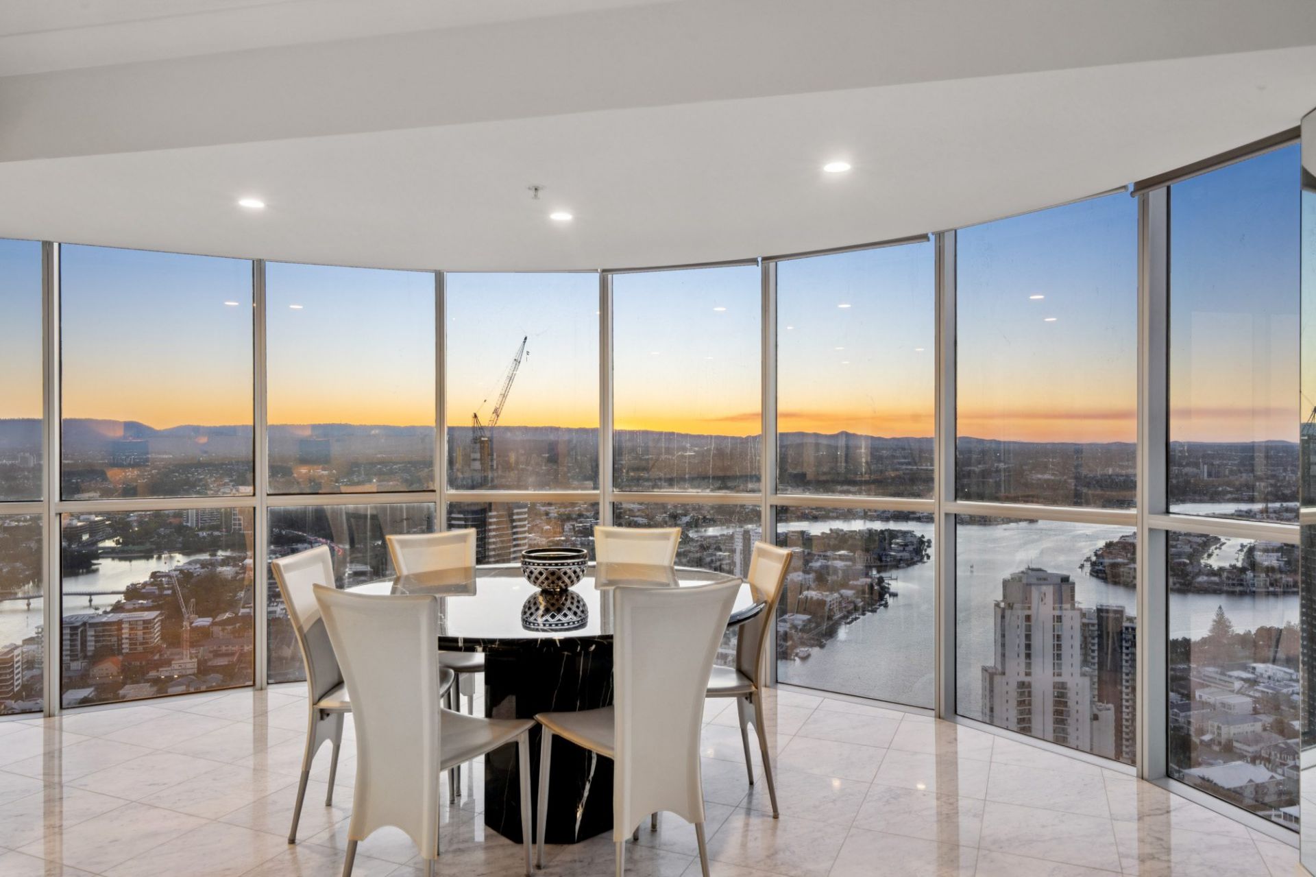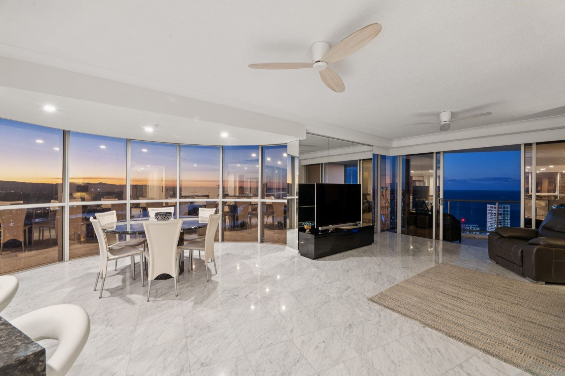 Step inside to discover open plan living and dining areas finished with elegant marble-tiled flooring and surrounded by floor-to-ceiling glass. The expansive layout is framed by panoramic outlooks stretching across the Pacific Ocean, Main River, Broadwater and hinterland - an ever-changing backdrop that defines coastal luxury.