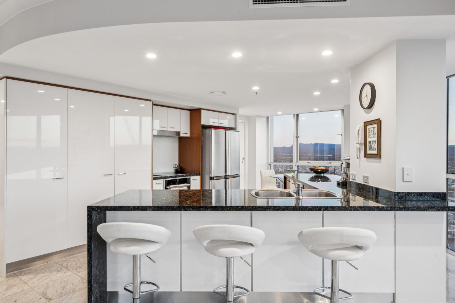 Centrally positioned is the newly renovated kitchen, designed for entertaining and everyday ease. Appointed with striking marble benchtops, an oversized island, it's both functional and beautiful. The kitchen opens effortlessly onto a large dining space and lounge that connect to two separate balconies, capturing sea breezes and morning light. Just adjacent is a clever breakfast nook - a bright and versatile space that could easily be styled as a home office or study, adding further value for remote workers or busy professionals.