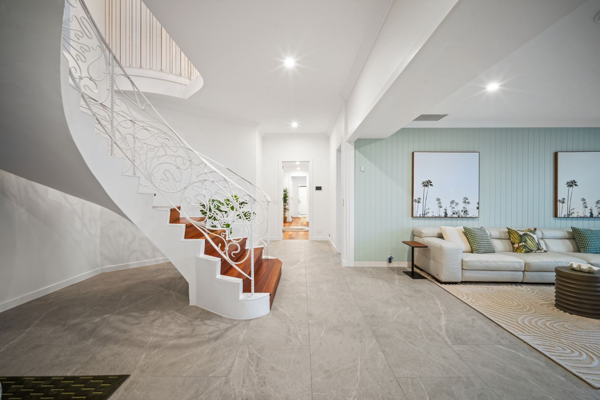 • Distinctive spiral staircase, Sydney blue gum timber floors, soapstone tiles, curved glazing, hand-cut stone walls, decorative cornicing and bespoke lighting