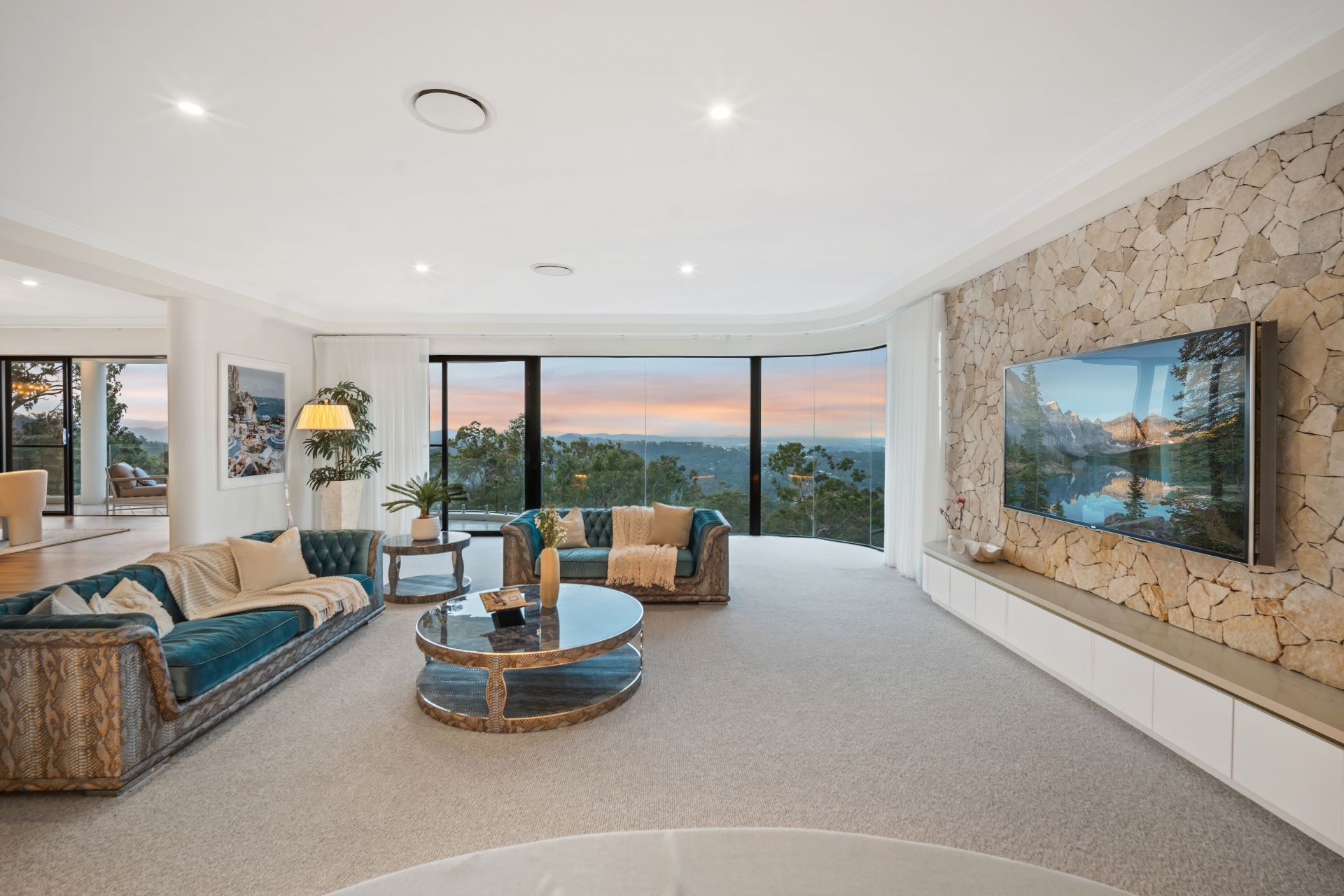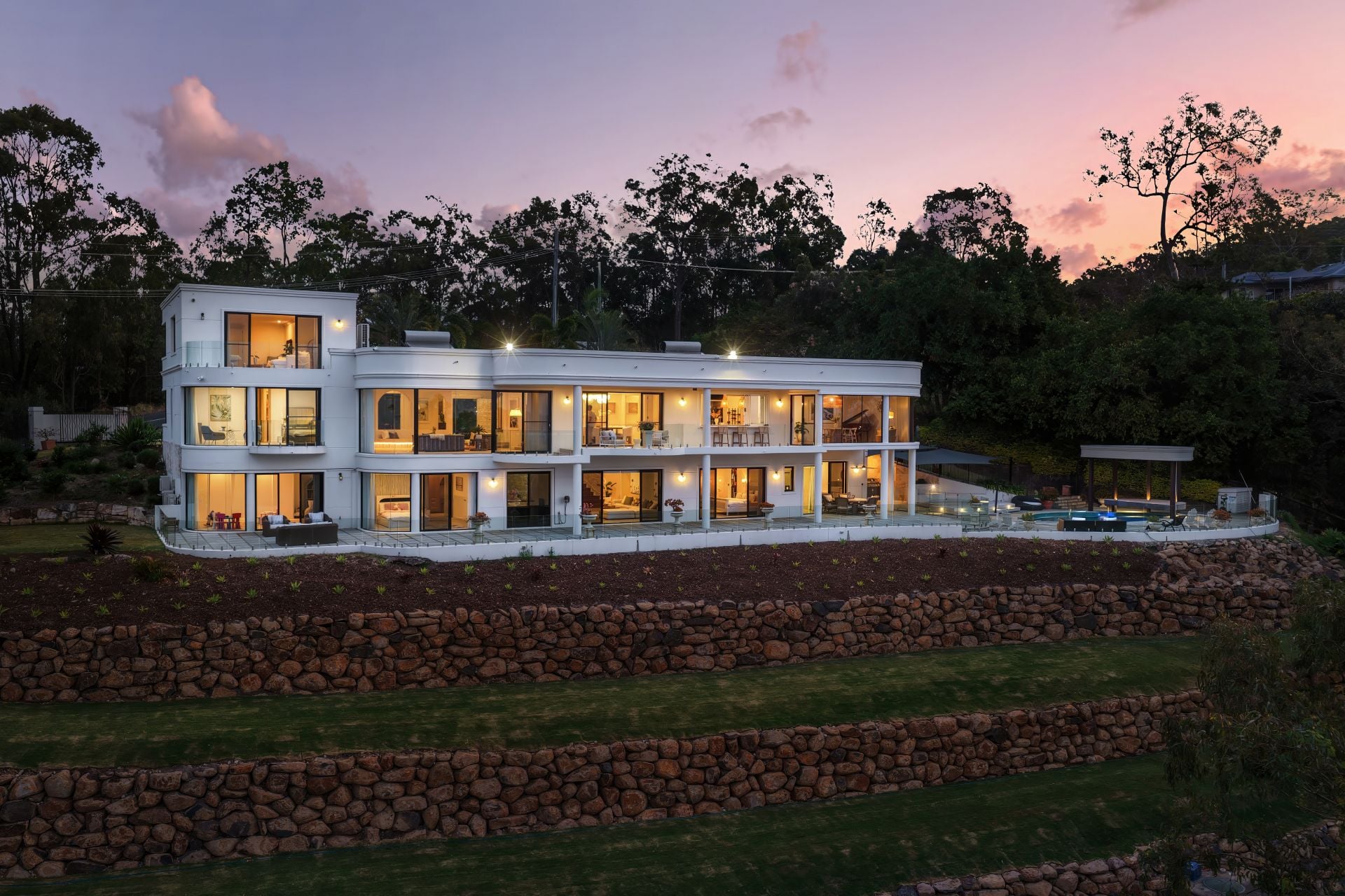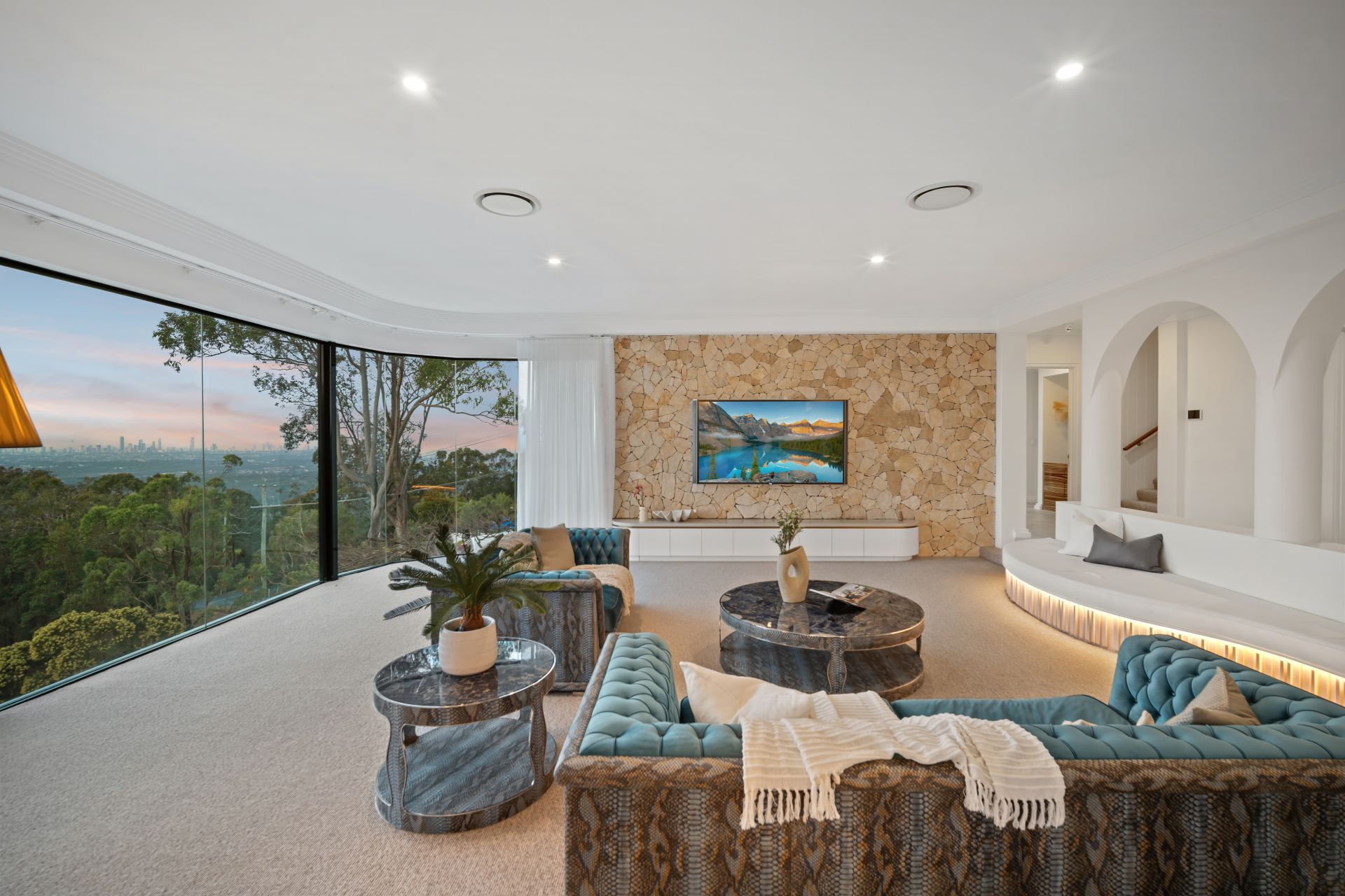 Commanding panoramic views of the ocean, city skyline and hinterland, this tri-level concrete residence crowns a sprawling 4.5ha Tallai estate. Step through medieval-style doors into a Palm Springs-inspired sanctuary, where bold architectural features frame breathtaking outlooks at every turn.