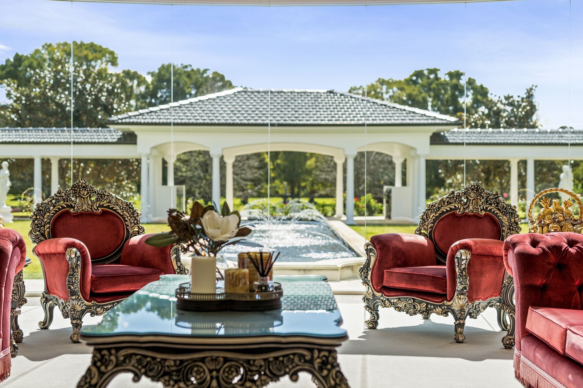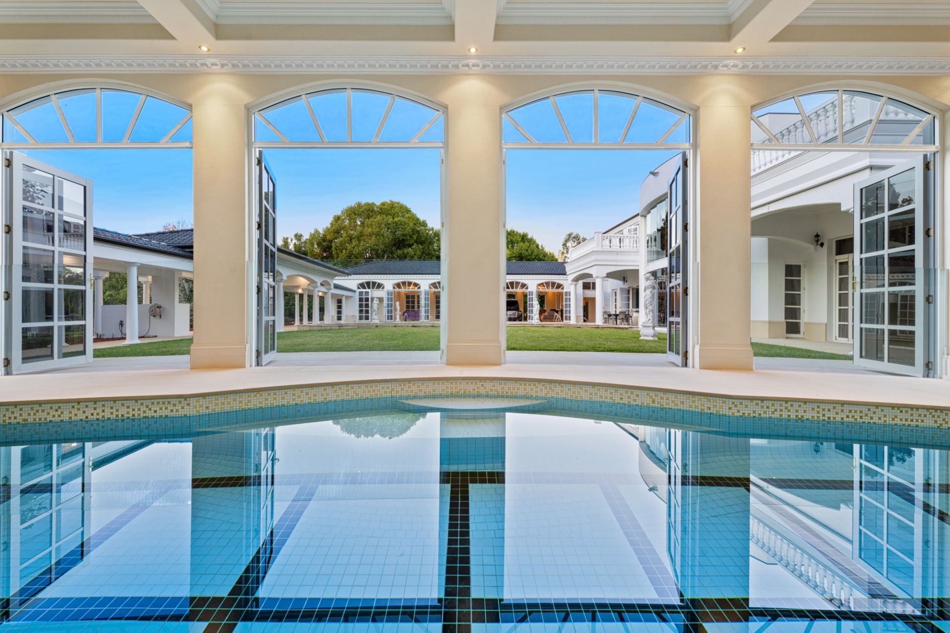 Additional superior features include a dining room to accommodate 12 guests, a sumptuous master suite with his and hers deluxe dressing rooms and ensuites, a gymnasium, commercial chicken shed and guest house. A heated indoor swimming pool with spa and sauna is nestled beneath a coffered ceiling and framed by romantic, arched French doors, plus the estate boasts a thriving fruit orchard and stables for equestrian enthusiasts, and a freshwater dam.