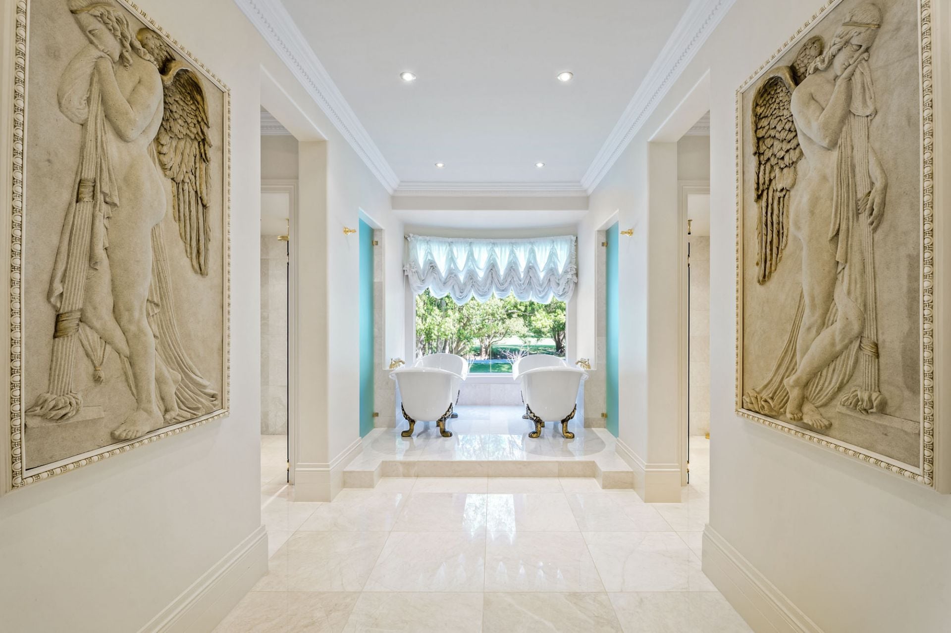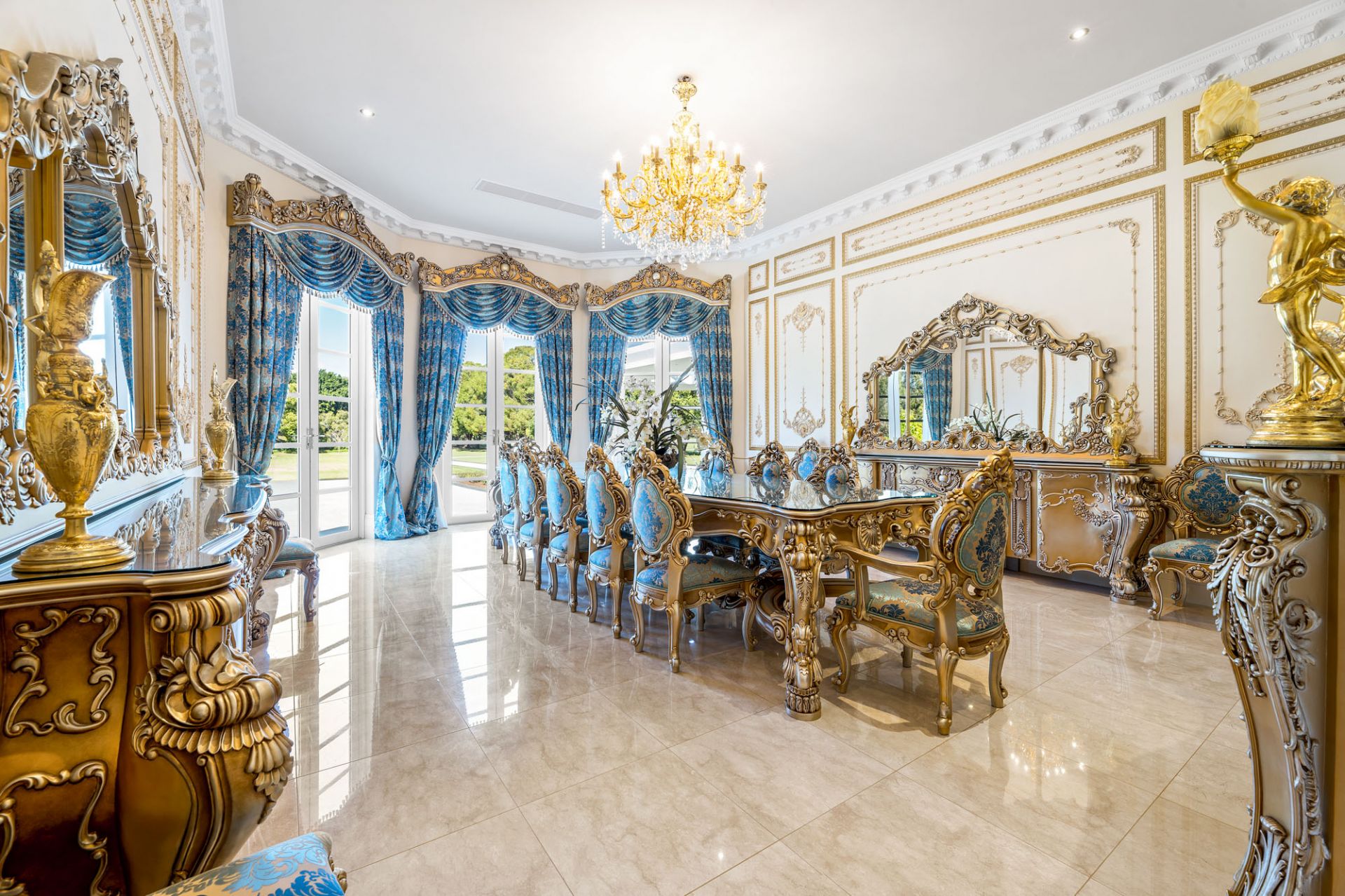 - Polished marble floors and soaring ornate ceilings.