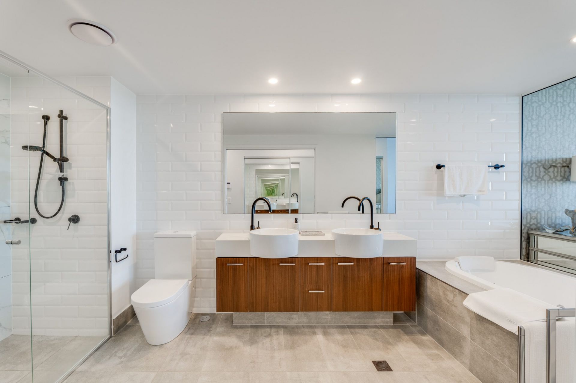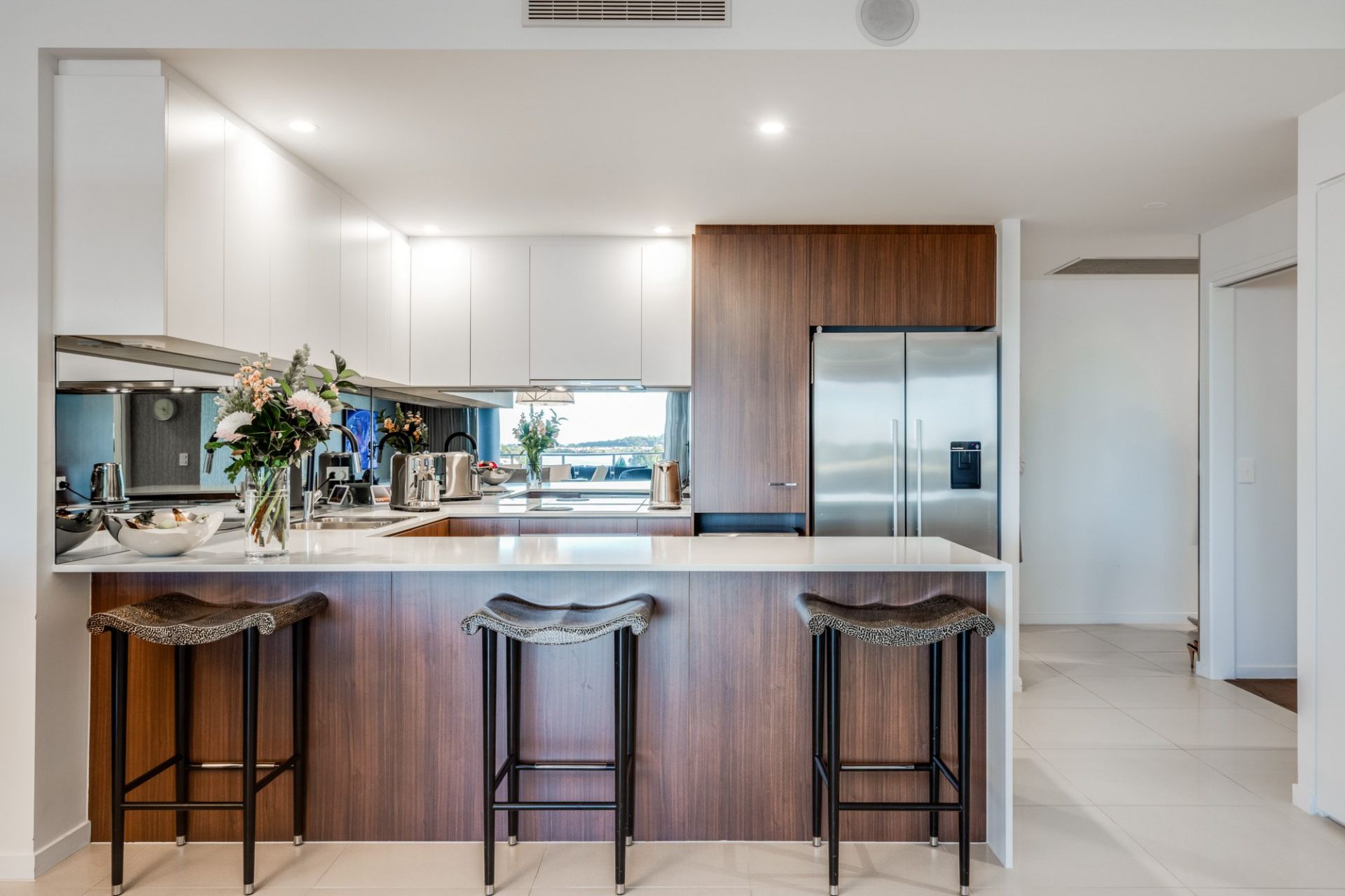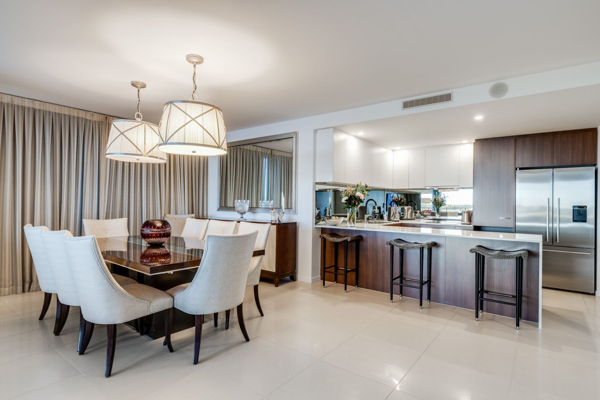 • Uniquely oversized and customised, boasting upgraded tapware and appliances, mirrored columns, elegant wallpaper and designer pendant lighting
