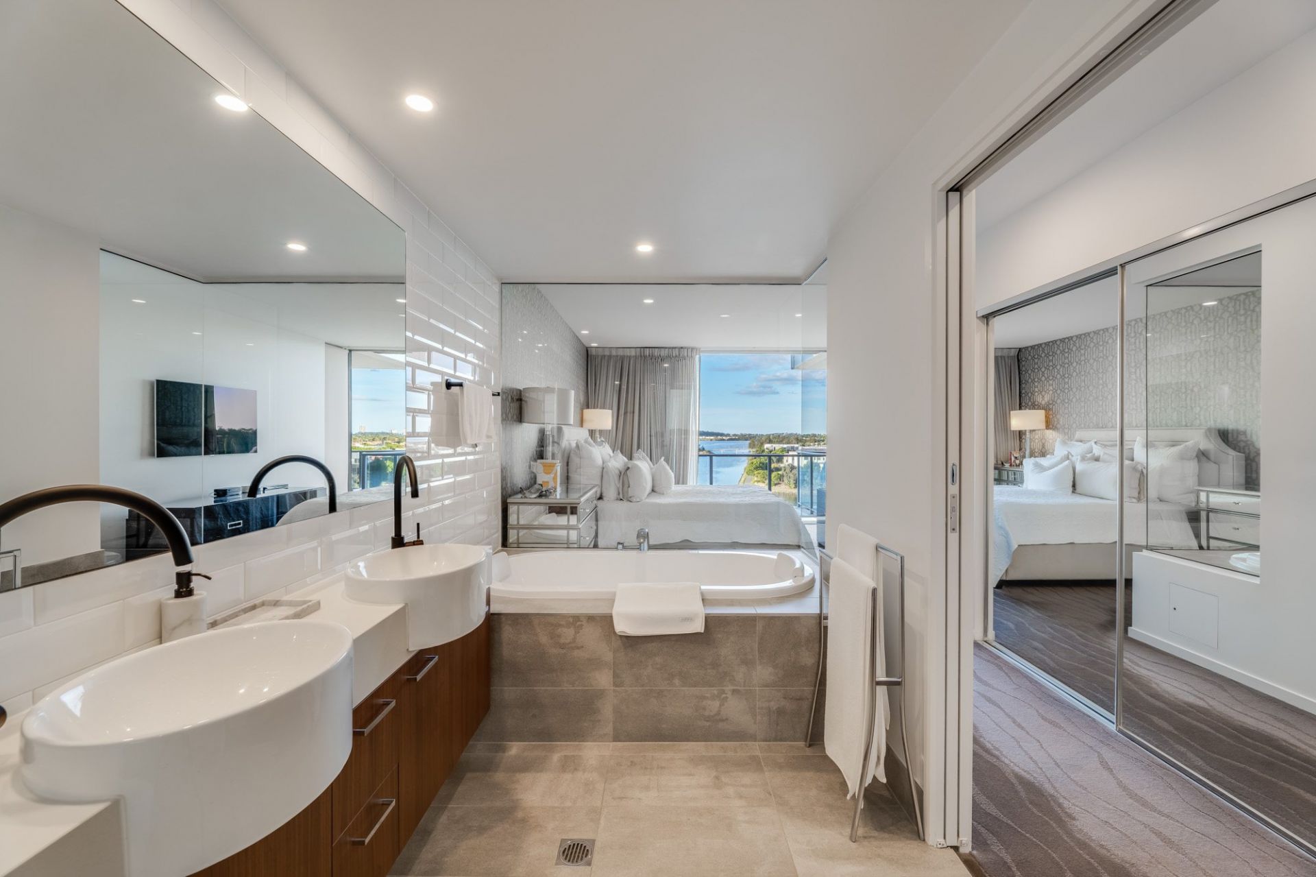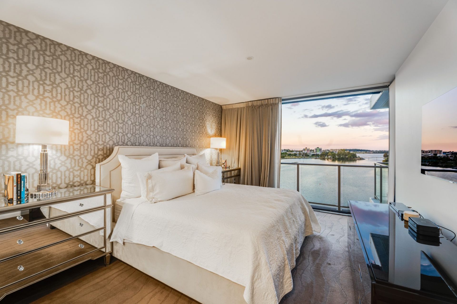 • Spacious lake-view master suite features a 55 inch TV, built-in robes with Stegbar joinery, ensuite including a deep soak spa and Hans Grohe tapware and Juliette balcony