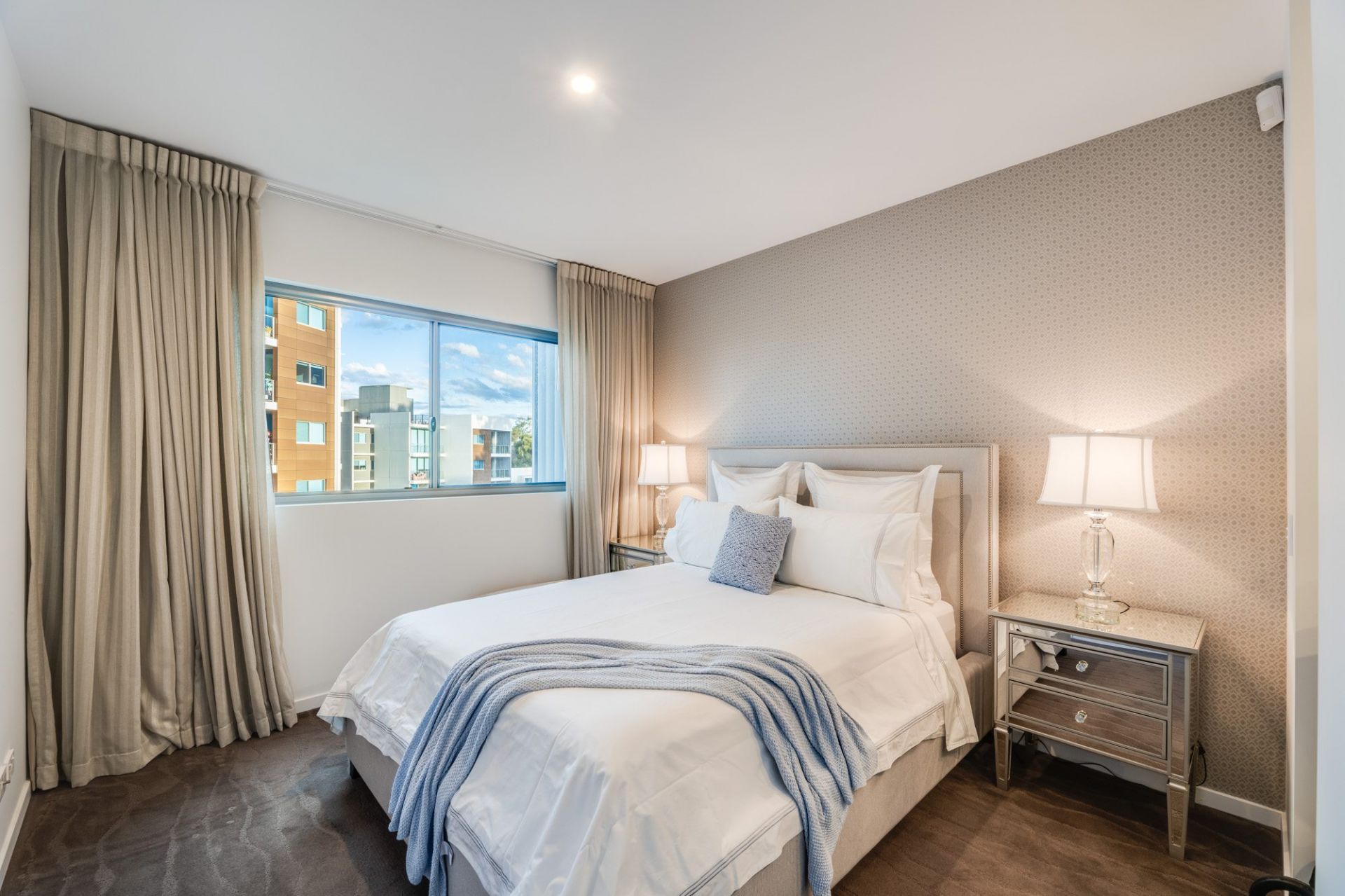 • Window dressings include linen blend sheers and block-out blinds