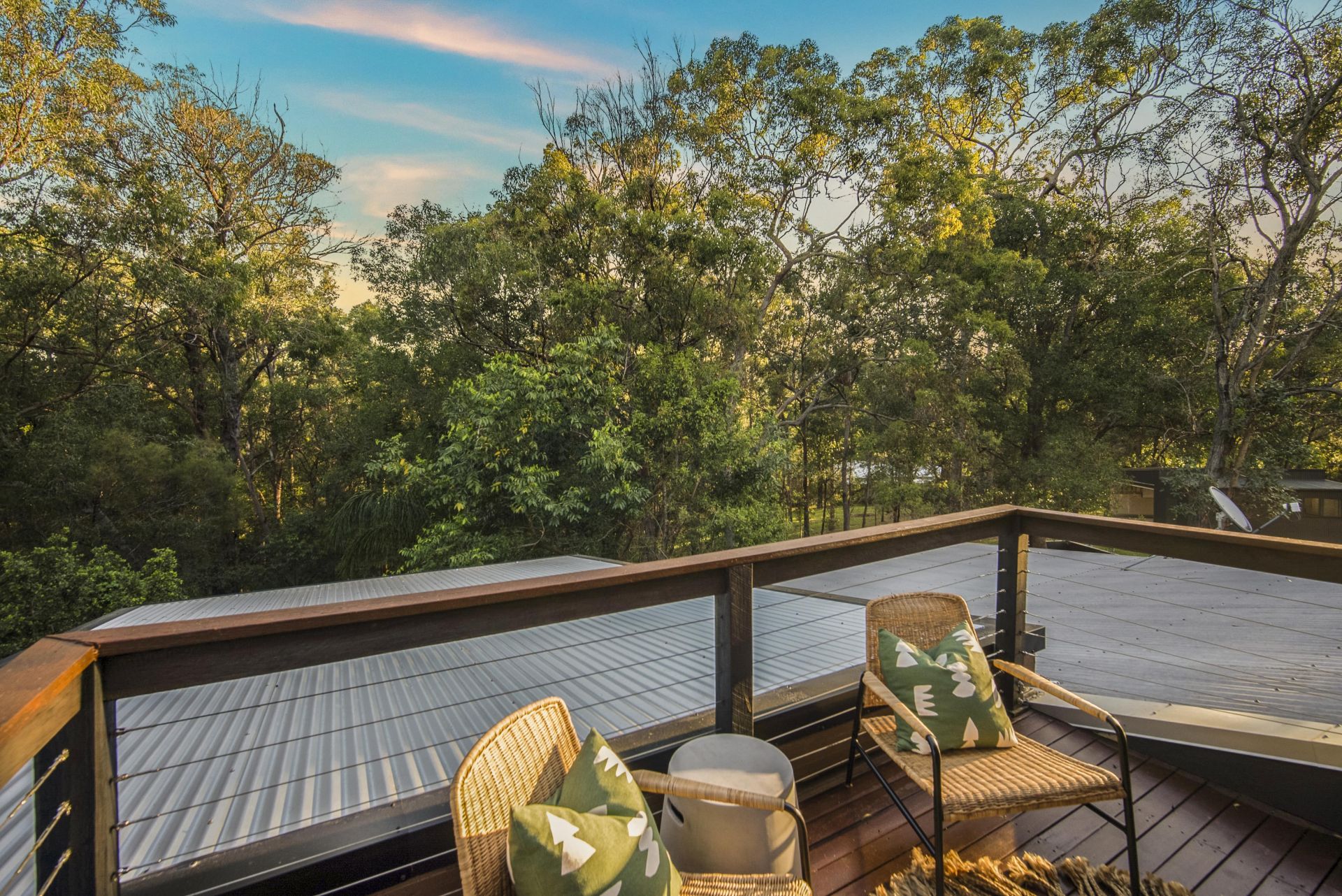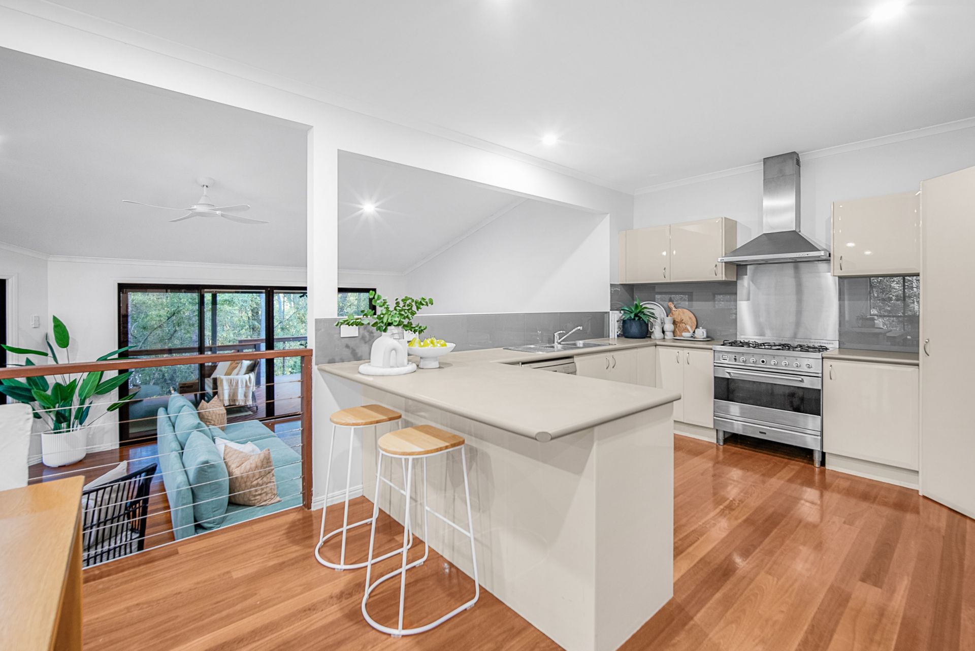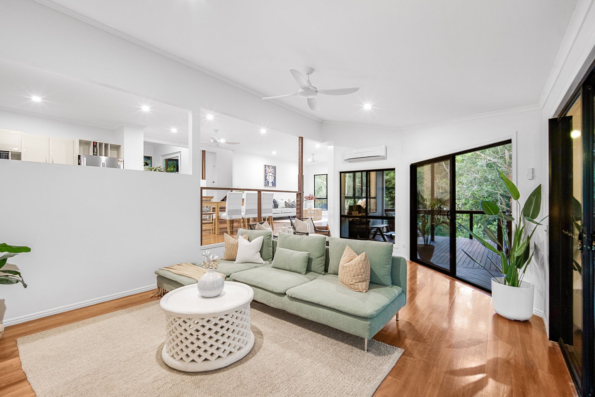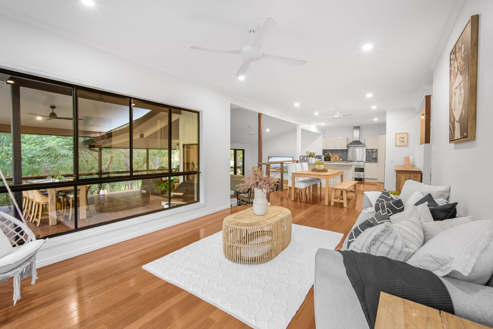 Open plan living with two lounge areas, kitchen and dining, light and bright with wrap around views of the foliage and trees with total privacy.