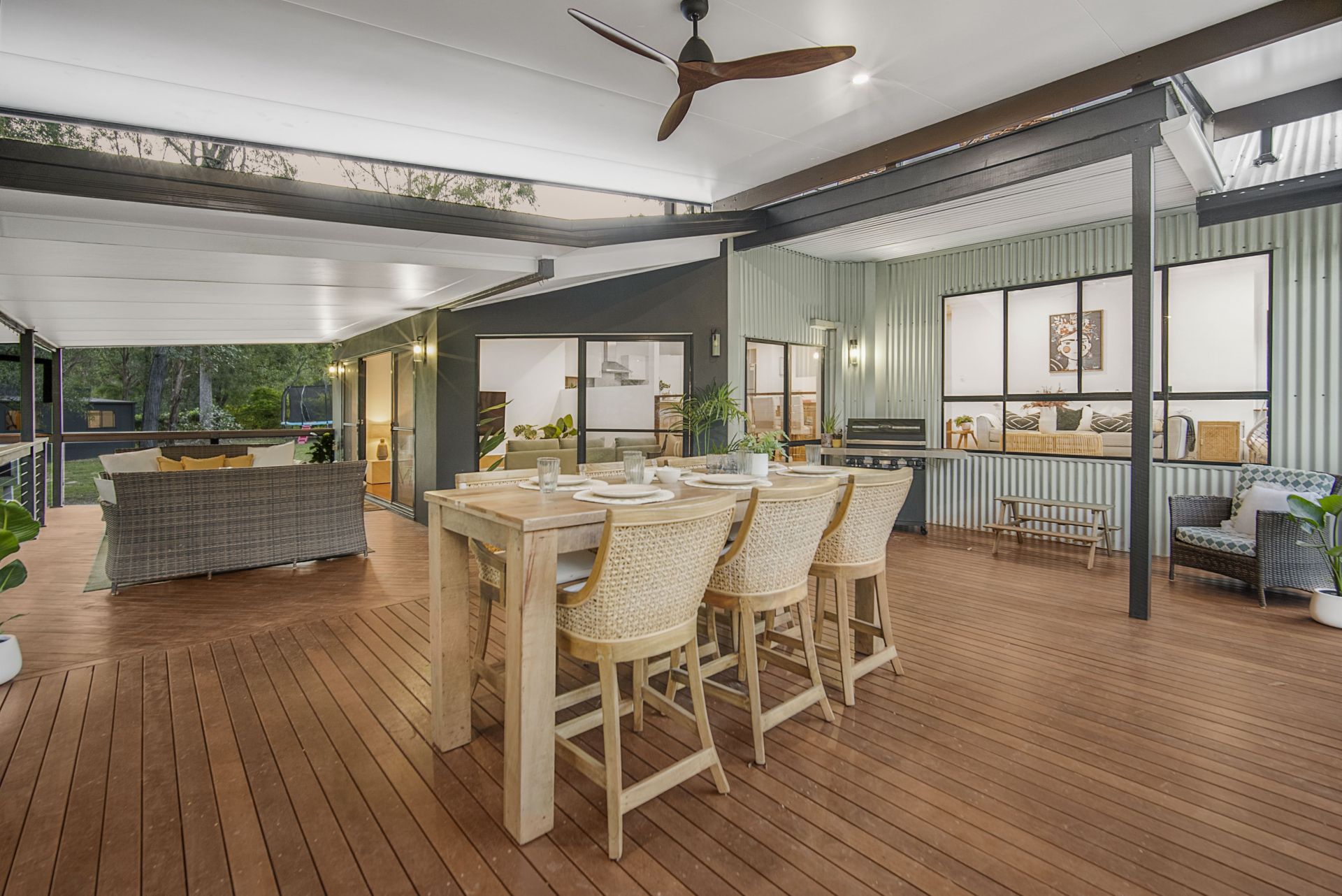80m2 premium deck extension made with a hardwood frame and Merbau decking with new flyover roof with ceiling fan.