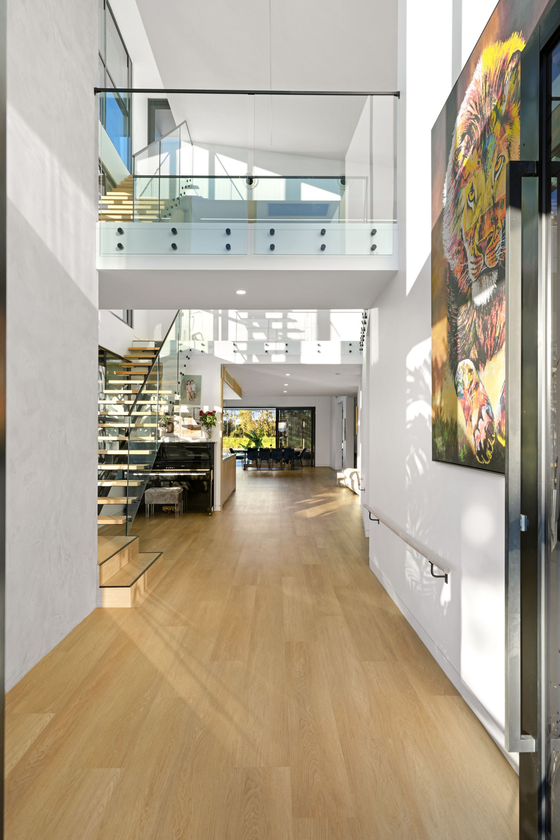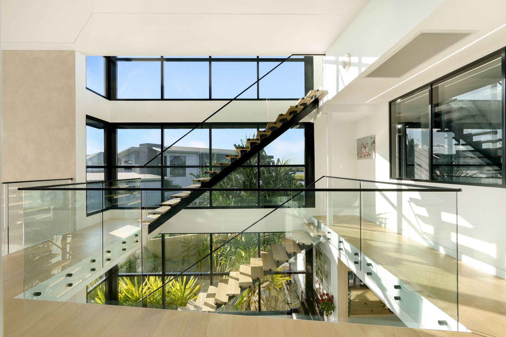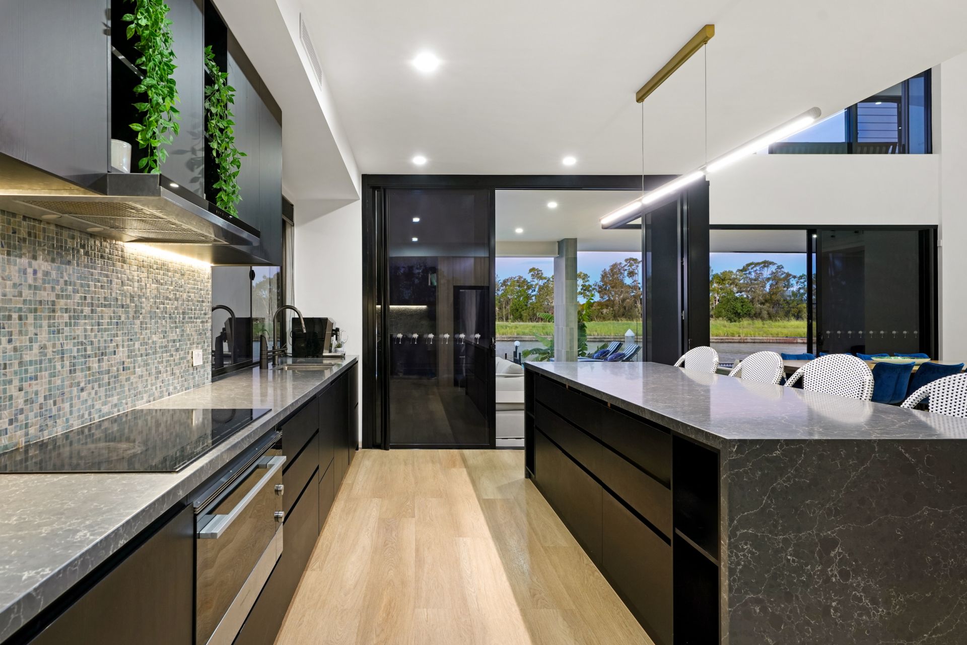 From the moment you enter, you're drawn through the open-plan living areas towards glistening water views. Full-height windows, natural materials, and a rich, dark interior palette create an inviting warmth, while capturing natural light and amplifying the home's dramatic sense of space.